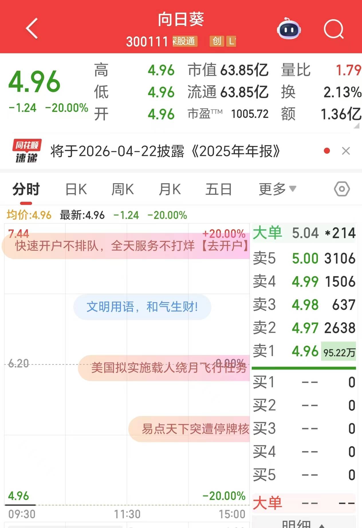 向日葵(300111。SZ)开盘跌停。截至发稿前,该股报4。96元/股,市值为63。85亿元。