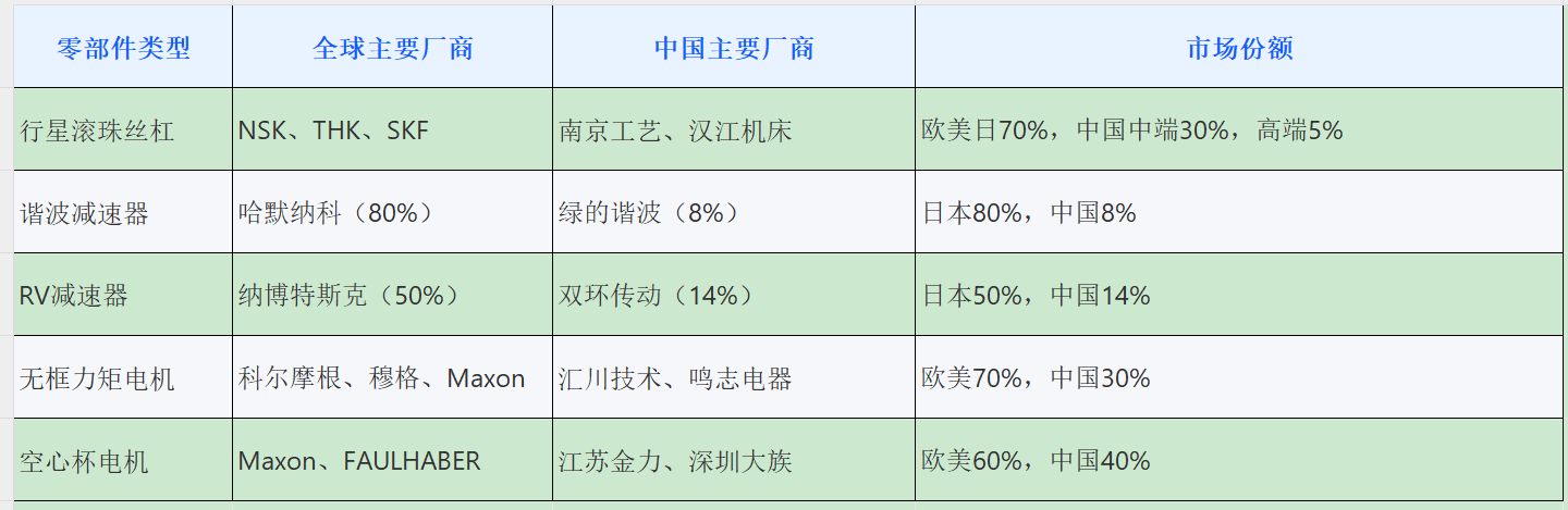 正在减速器范畴,日本企业仍占领从导地位,哈默纳科占领全球谐波减速器市场 80% 摆布的份额,纳博特斯克占领 RV 减速器市场约 50% 的份额。然而,中国企业正正在快速逃逐,绿的谐波做为国内谐波减速器龙头,市占率已提拔至 25%,其产物可使用于人形机械人关节传动部位,已为小米、宇树科技等供给配套办事。