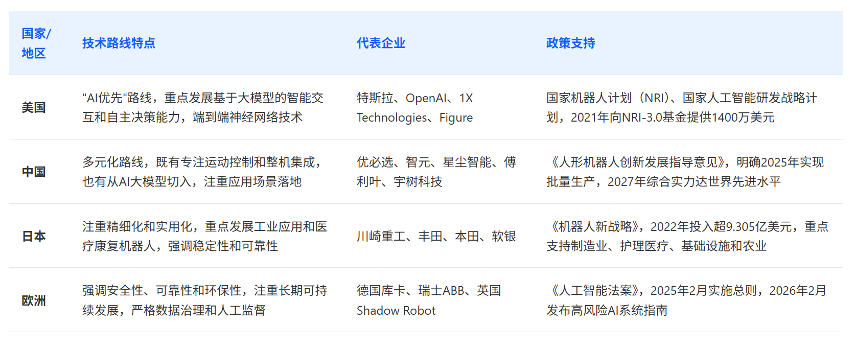 美国市场凭仗其正在人工智能、芯片手艺和风险投资方面的保守劣势,正在人形机械人范畴连结着手艺引领地位。美国企业正在 AI 算法、焦点芯片和底层手艺架构方面具有绝对劣势,以 OpenAI、特斯拉、Figure 等为代表的美国企业正在具身智能大模子和高端人形机械人研发方面处于全球领先地位。美国通过人打算(NRI)和国度人工智能研发计谋打算等政策东西,为财产成长供给了强无力的支撑。