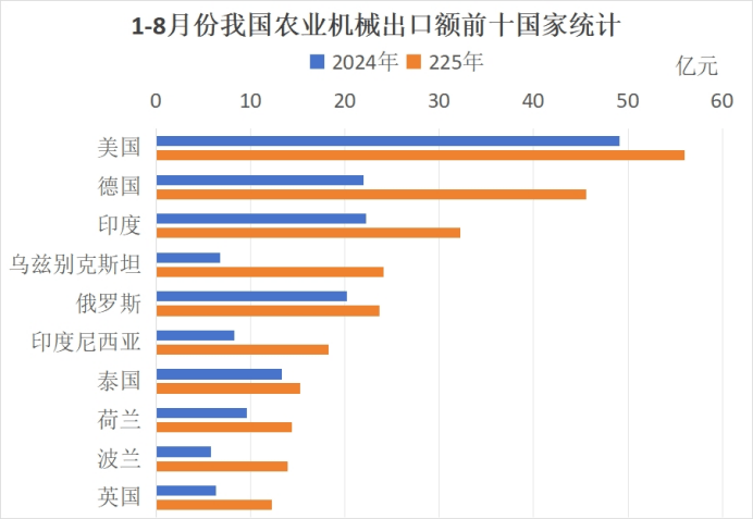 畴前十出口国度的出口规模来看,对这前十国度的出口规模层级分明:头部市场不变,第二梯队扩容。从出口额绝对值看,前十国度呈现“1个超500亿元头部市场、2个300亿-400亿元中坚市场、7个100亿-250亿元潜力市场”的层级布局,全体集中度较高但梯度差别显著:头部焦点市场:美国以560。12亿元出口额稳居第一,虽仍是我国农机出口的最大单一国度市场,但取第二名(455。75亿元)的差距较2024年(2024年美国491。15亿元、219。75亿元)大幅缩小,头部地位相对弱化,这取本年岁首年月中美商业摩擦有很大关系;中坚增加市场:(455。75亿元)取印度(322。16亿元)形成第二梯队,二者出口额均冲破300亿元,较2024年(219。75亿元、印度221。95亿元)实现规模翻倍或大幅扩容,成为支持出口增加的主要力量;潜力拓展市场:乌兹别克斯坦(240。97亿元)、俄罗斯(236。46亿元)、印度尼西亚(182。45亿元)等7国构成第三梯队,出口额集中正在120亿-240亿元区间,此中乌兹别克斯坦、印度尼西亚等市场同比增幅超120%,规模快速攀升,成为梯队内的“增加前锋”,是我国农机出口的次要新兴市场。畴前十国度的增速来看,增加动能差别显著:新兴市场迸发,前十国度同比增速跨度极大(14。04%~256。77%),呈现“新兴市场迸发式增加、保守市场稳健增加”的明显分化,增加动能次要来自非欧美地域的农业需求:超高速增加国度(增速100%以上):乌兹别克斯坦(256。77%)、印度尼西亚(121。07%)、波兰(141。59%)、(107。4%)四国表示最为凸起。此中乌兹别克斯坦增速超2。5倍,乌兹别克斯坦的农业以棉花、小麦种植为焦点的特点,我国农业机械对其增加次要源于棉花采摘机、耕整地机械、播种机械、结合收割机等品类的出口激增。对印度尼西亚出口大涨,取我国农机产物正在亚洲市场影响力加强有很大关系,也受益于本地农业机械化率提拔,对中小型拖沓机、结合收割机等农机产物的需求大幅添加。对波兰、的出口市场,则次要得益于割草机的出口,本年前8个月曾经对波兰出口割草机超9亿元,较客岁同期添加了6。5亿元。中高速增加国度(增速40%~100%):印度(45。15%)、荷兰(49。87%)、英国(94。28%)增速介于45%~95%之间。印度做为农业大国,对农机的需求势必可不雅,结合收割机、喷雾器、耕整地机械等产物出口增加显著。荷兰、英国市场的增加,次要受益于割草机出口的带动。天井草坪凡是需要投入大量时间和精神,割草机是一个常用的东西。我国的割草机企业通过手艺立异,实现了割草机的智能化升级,有智能割草机以至能预设图案进行“草坪打印”,这使得中国的智能割草机正在欧美市场的承认度获得了大大提拔。稳健增加国度(增速10%~20%):美国(14。04%)、俄罗斯(17。03%)、泰国(15。02%)增速相对暖和。美国市场基数大且本土农机财产成熟,我国农机以“高性价比”切入细分范畴(如零部件、割草机、喷雾器等),虽然受摩擦影响,但仍然走出了稳健的增速。俄罗斯受地缘要素及农业规模化推进影响,对耕整地机械、喷雾器、割草机的需求稳步增加。泰国做为东南亚水稻从产国,对插秧机、耕整地机械、农机零部件等相关农机的需求支持出口平稳增加。2025年我国初次正在泰国举办海外农机展会,对我国农机企业开辟东南亚市场,是一个无力的推进要素。从份额占比来看,保守从力出口市场占比下降,新兴市场话语权提拔。从近两年的占比变更来看,前十国度内部份额呈现“保守欧美头部市场占比收缩,新兴及欧洲中东欧市场占比提拔”的趋向,出口市场多元化结构成效初显。份额收缩的保守从力市场:美国占比从14。86%降至11。04%,降幅最大(3。82个百分点),虽仍是第一,但对出口的拉动感化削弱;印度占比从6。71%微降至6。35%,俄罗斯从6。11%降至4。66%,泰国从4。01%降至3。00%,这些保守需求市场占比的小幅下滑,反映出我国农机出口对单一市场的依赖度降低。份额提拔的高增加市场:占比从6。65%升至8。98%(添加2。33个百分点),成为份额提拔最显著的欧美市场,取我国智能化、高性价比割草机广受用户承认相关,本年前8个月对德出口割草机超38亿元,较客岁同期添加了21。58亿元。乌兹别克斯坦占比从2。04%跃升至4。75%,从客岁的第十一位跃升至第四位,成为份额增加最快的新兴市场。印度尼西亚占比从2。50%升至3。60%、波兰从1。75%升至2。75%,这些市场的份额提拔,进一步丰硕了我国农机出口的地域分布,降低了对欧美保守市场的依赖风险。从我国农业机械的出口省份来看,农机出口大省集中正在江苏、浙江取。前八个月,这三个省份共计实现农业机械出口304。5亿元,占了全国农业机械出口总额的60%。