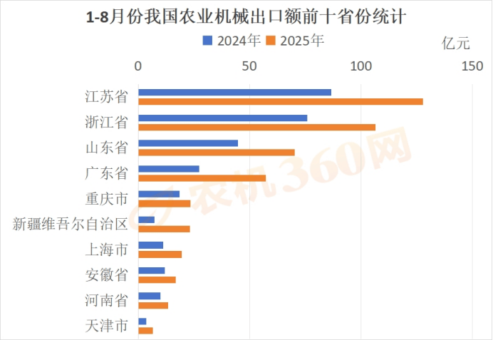 2025年前8月,我国农机出出亮眼成就单,出口总额达508。38亿元,笼盖全球219个国度和地域,市场多元化结构成效初显。从区域分布看,欧洲、亚洲仍是从力市场,非洲、南美洲、大洋洲等新兴市场增势迅猛;前十出口国度呈现梯度分明的层级布局,新兴市场迸发式增加取保守市场稳健增加构成明显对比;国内出口省份则以江浙为焦点引擎,新疆、广东等“黑马”区域增速亮眼。全体而言,我国农机出口正从依赖保守市场向多区域、多动能驱动改变,为全年冲破700亿元出口额方针奠基根本,也预示着行业向高质量成长迈出环节程序。截至2025年8月底,我国农业机械对外出口总额达到了508。38亿元,出口地遍及全球219个国度和地域,较客岁同期净增4个国度和地域,我国农业机械出口市场愈加多元化。从出口地的区域分布来看,我国农业机械的出口市场次要集中正在欧洲和亚洲。1-8月份,对欧洲国度和地域出口农机总额近189亿元,占我国农机对外出口总额的37%,其占比力客岁同期增加了3。5个百分点。对亚洲国度和地域的农机出口总额跨越了174亿元,占比为34%。对洲的出口额也相对较高,前8个月出口农机7元,占比为14%,其占比力客岁同期下滑了4个百分点。本年以来对非洲、南美洲、大洋洲的出口市场也正在快速兴起,出格是前8个月对大洋洲的农机出口额跨越了12亿元,较客岁同期添加了74%,有很大的增加幅度。但从占比来看,我国对非洲、南美洲、大洋洲的农机出口占比,还相对较小,远低于对欧洲、亚洲取洲的出口量。但这些新兴市场增势喜人,值得等候。
